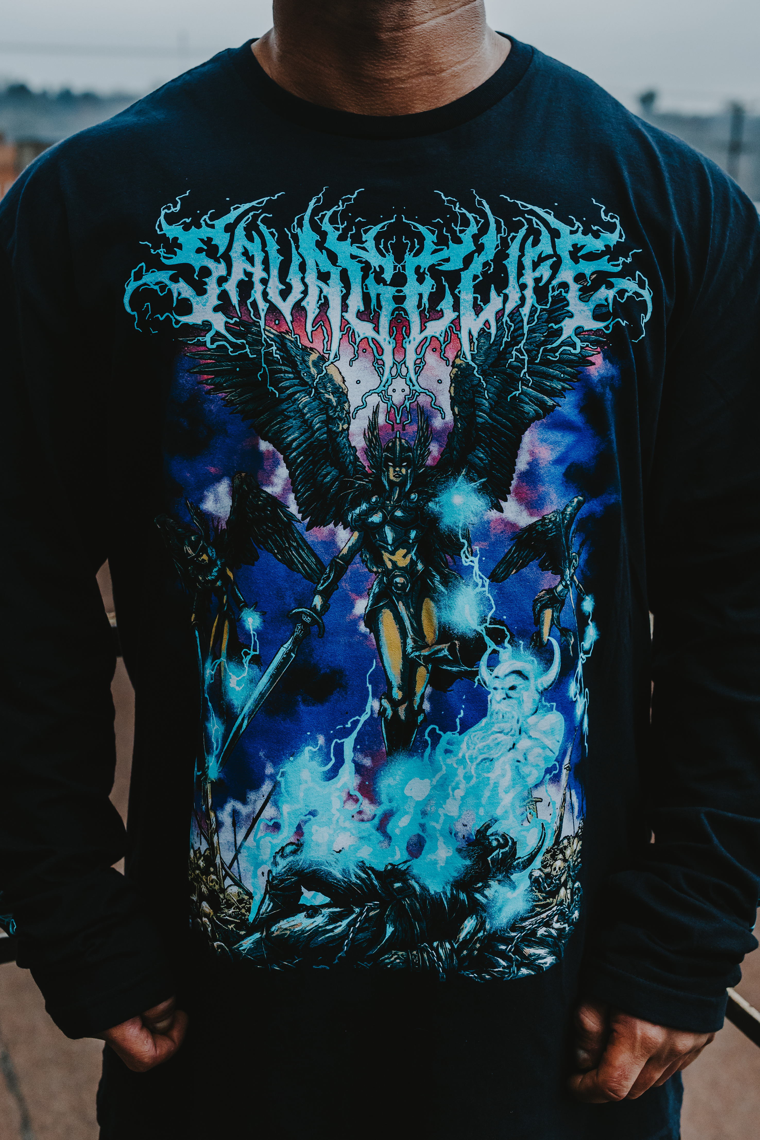 Conquer the realm of style with The Chosen Long Sleeve - Divine Power Edition. Featuring Freyja and her Valkyries descending to claim the fallen, this wearable masterpiece is adorned with her Valkyrie sword running down the right sleeve, symbolizing the divine descent and chosen strength. On the left sleeve, the bold imprint of "Savage Life" declares your commitment to the unapologetic spirit.